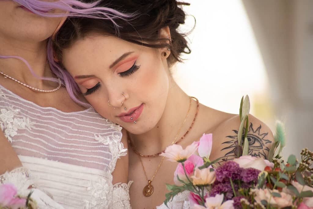 Putting your hand on your partner’s beating heart is a calming pose that allows the two of you to connect on a busy wedding day. What’s more comforting than your partner’s strong beating heart? If you feel nervous at all on your wedding day we’ll suggest that you focus on one another and connect with each other in your preferred ways. Do you need some time alone together? Just let us know! We’re here to support you on all levels, on your wedding day.