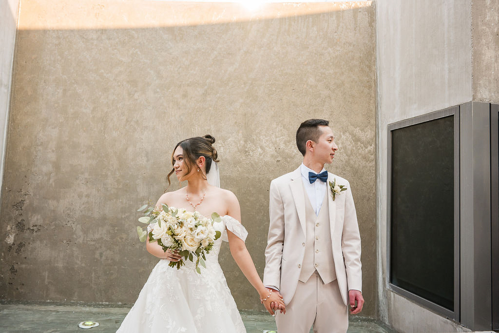 To create a cool mood, try looking in the opposite direction of your partner. This can come across editorial and edgy, or like a mild and humorous disagreement about what to have for dinner. There are lots of variations of this pose, sometimes as simple as looking in opposite directions, or having your body face in different directions. This pose takes some trust for your photographers, and we’ll help you to make it look good. A fun element of this pose is when you turn back toward each other with fresh love in your eyes on your wedding day.